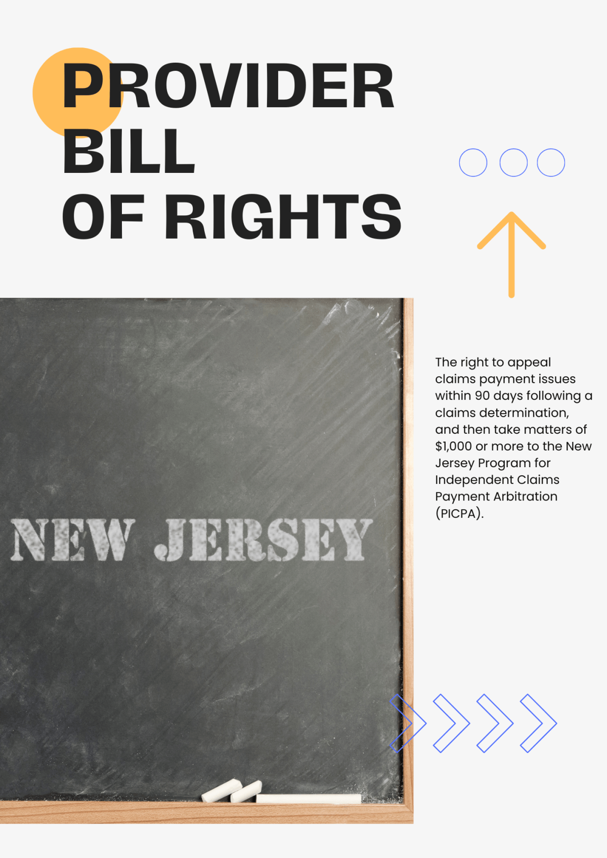 The right to appeal claims payment issues within 90 days following a claims determination, and then take matters of $1,000 or more to the New Jersey Program for Independent Claims Payment Arbitration (PICPA).